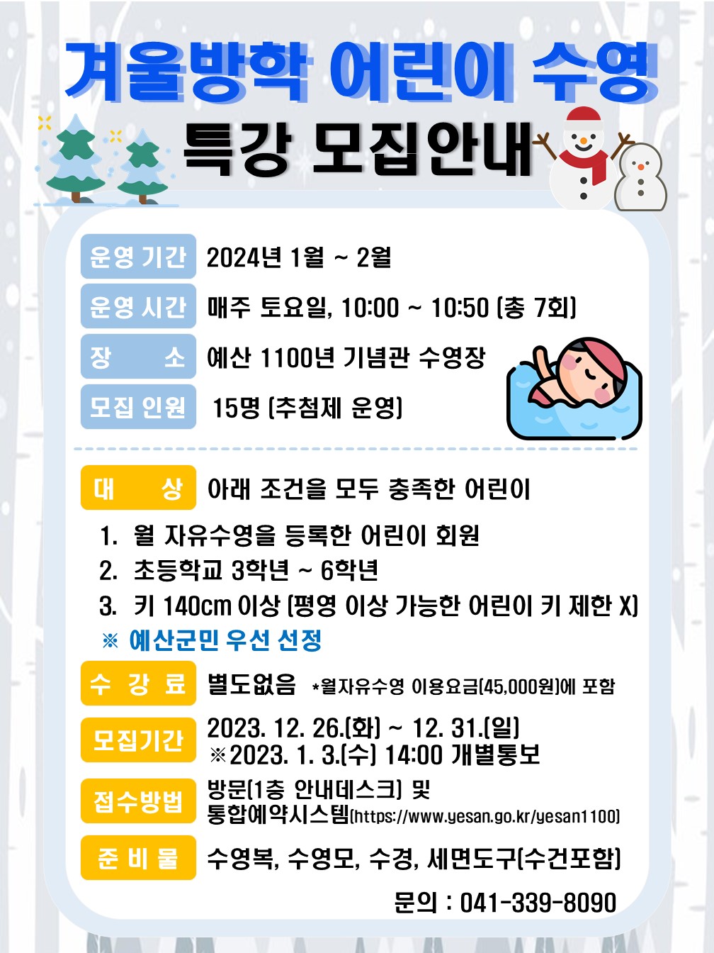 겨울방학 어린이 수영특강 모집 안내 작성자 양정령 등록일자 2023년 12월 24일 16시 35분 17초 조회 444 예산 1100년 기념관에서 겨울방학 어린이 수영특강반을 운영합니다. 월 자유수영을 등록한 초등학교 3학년~6학년(키 140cm 이상, 평영이상 가능시 키 제한 없이 접수가능) 대상이오니 많은 관심 바랍니다. 자세한 내용은 붙임 첨부물을 참고해주세요. 어린이수영 방학특강 안내.jpg [ Size : 266.83KB , Down : 314 ] 미리보기 다운로드 목록보기