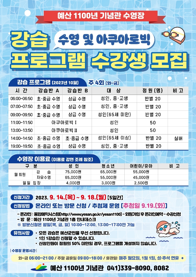 많이 기다려 주셔서 감사드립니다. 예산 1100년 기념관 수영장이 드디어 수강생을 모집합니다. 강습반은 운영상황을 보며 점차 개설해 나갈수 있도록 노력하겠습니다. *강습 프로그램 수강생 모집 안내* ▶ 모집대상: 수영 10개 반(200명), 아쿠아로빅 2개 반(100명) - 강습은 주4회(화~금) 진행합니다. ▶ 신청기간: 9.14.(목) ~ 9.18.(월) [5일간] ▶ 신청방법: 온라인 또는 방문접수 후 추첨제 운영 ▶ 추첨일정: 9.19.(화) 14:00 예정(온라인 추첨 후 선정자 안내 문자 발송) 자세한 내용은 홍보물을 참고해주시기 바랍니다. 감사합니다.