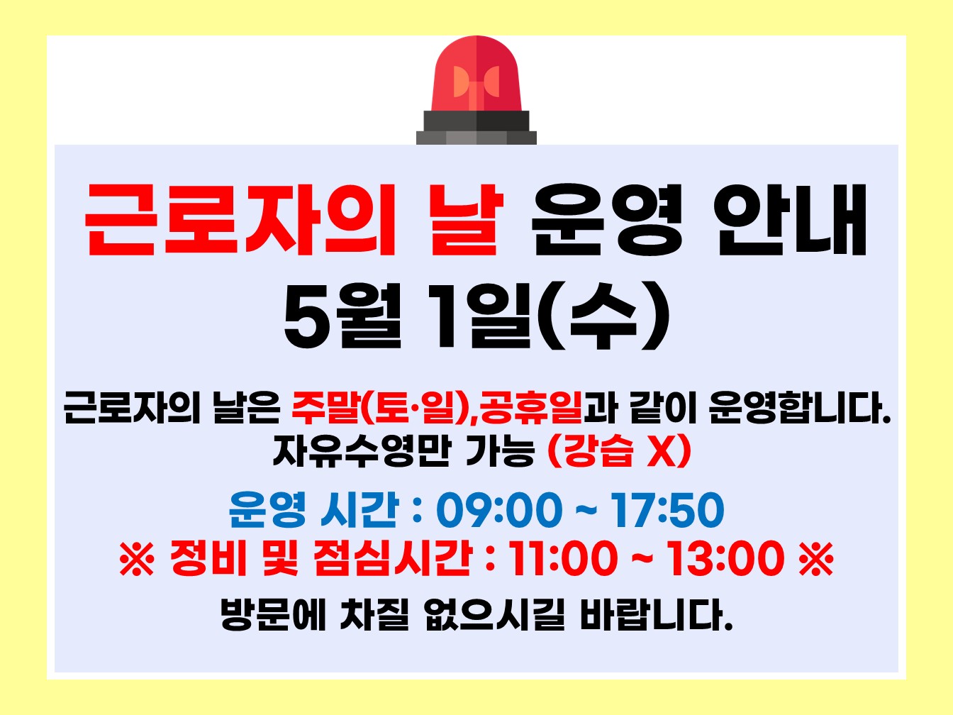안녕하세요. 예산 1100년 기념관입니다. 근로자의 날(5.1) 수영장 및 기념관 시설 이용 시간을 안내하오니 이용 시간에 착오 없으시길 바랍니다. ※강습 회원이신 분들은 5월 2일(목)부터 강습 시작합니다. 날짜 : 5월 1일(수) 운영 시간 : 09:00~17:50 정비 및 점심시간 : 11:00~13:00 감사합니다.