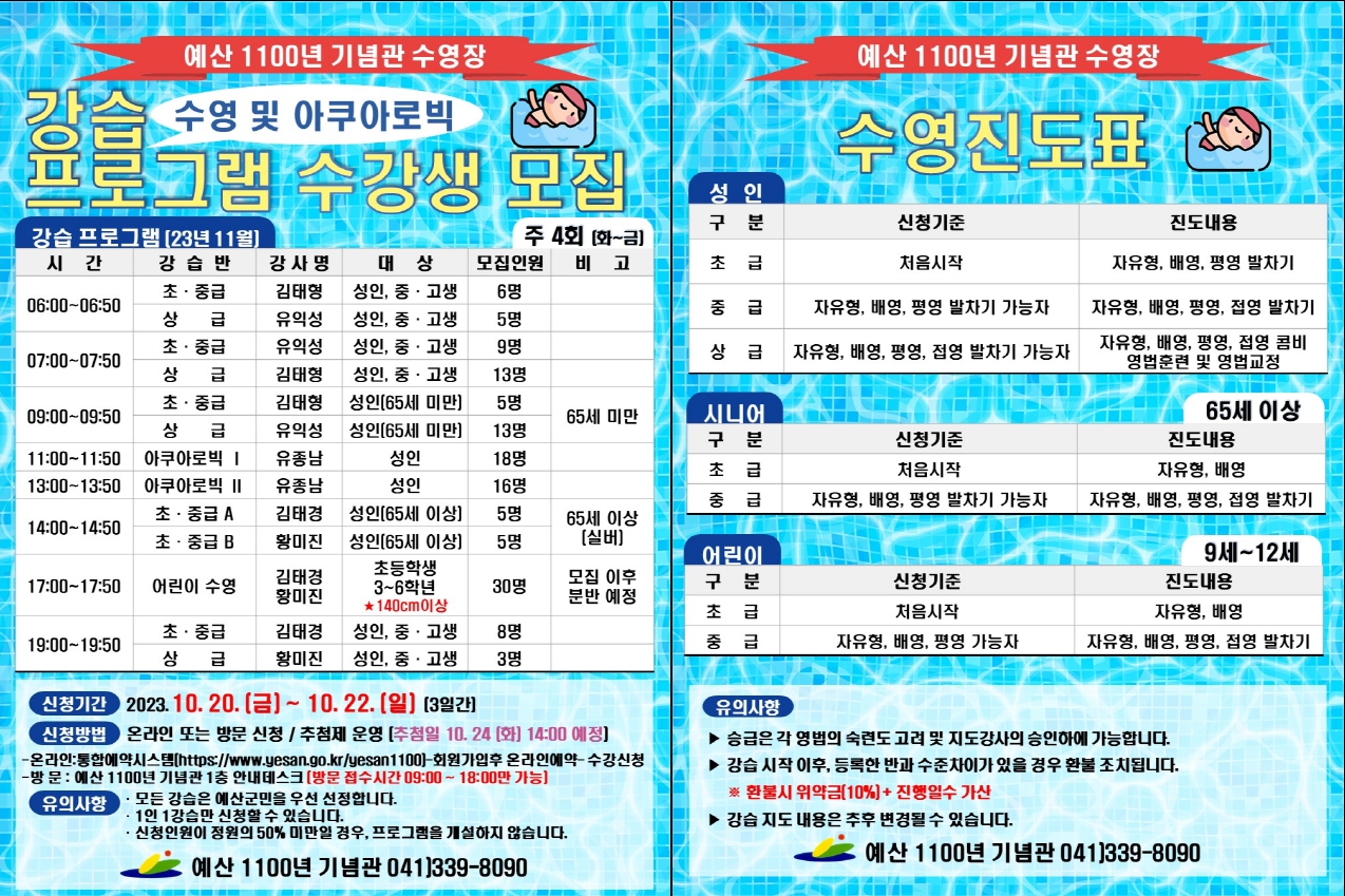 2023년 11월 수영장 신규 회원 모집 인원 및 일정을 안내하오니 이용에 참고하시기 바랍니다.