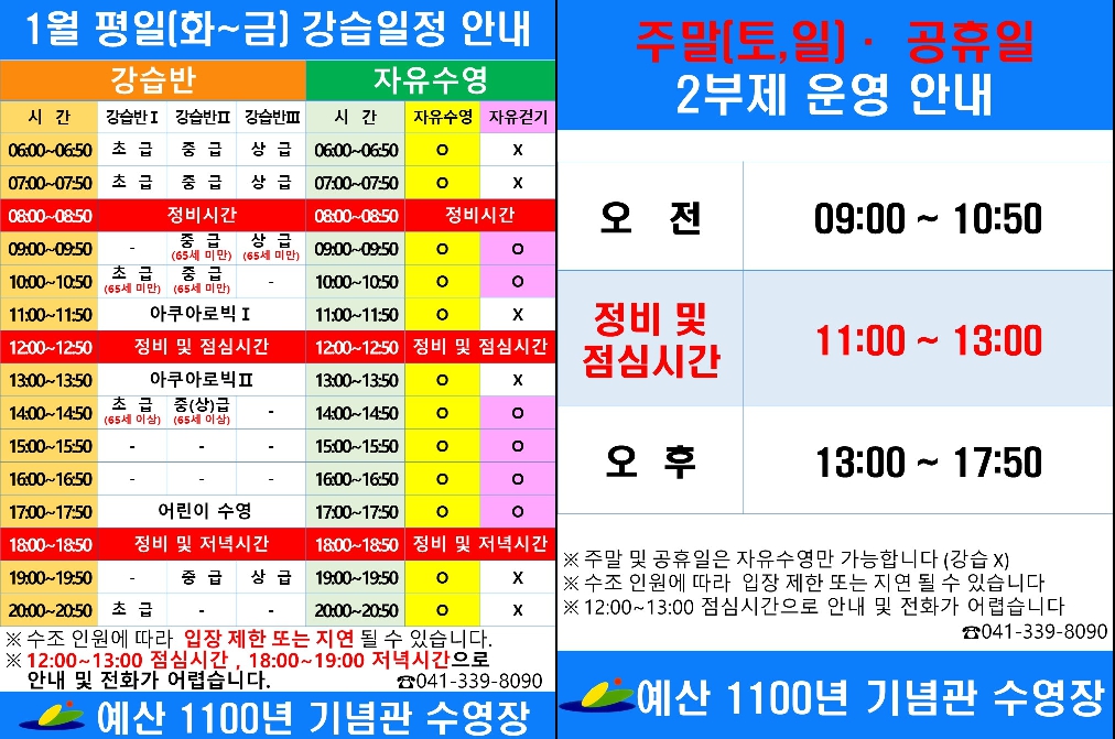 2024년 예산 1100년 기념관 수영장 운영(개선사항) 안내 작성자 양정령 등록일자 2023년 12월 24일 16시 42분 26초 조회 905 예산 1100년 기념관 운영에 대해 2024년 개선사항을 붙임과 같이 안내드립니다. 이용에 불편하시더라도 많은 관심과 협조 부탁드립니다. 2024년 개선사항 안내.jpg [ Size : 282.44KB , Down : 762 ] 미리보기 다운로드 2024년1월 평일및주말 운영안내.jpg [ Size : 494.35KB , Down : 1,007 ] 미리보기 다운로드 목록보기