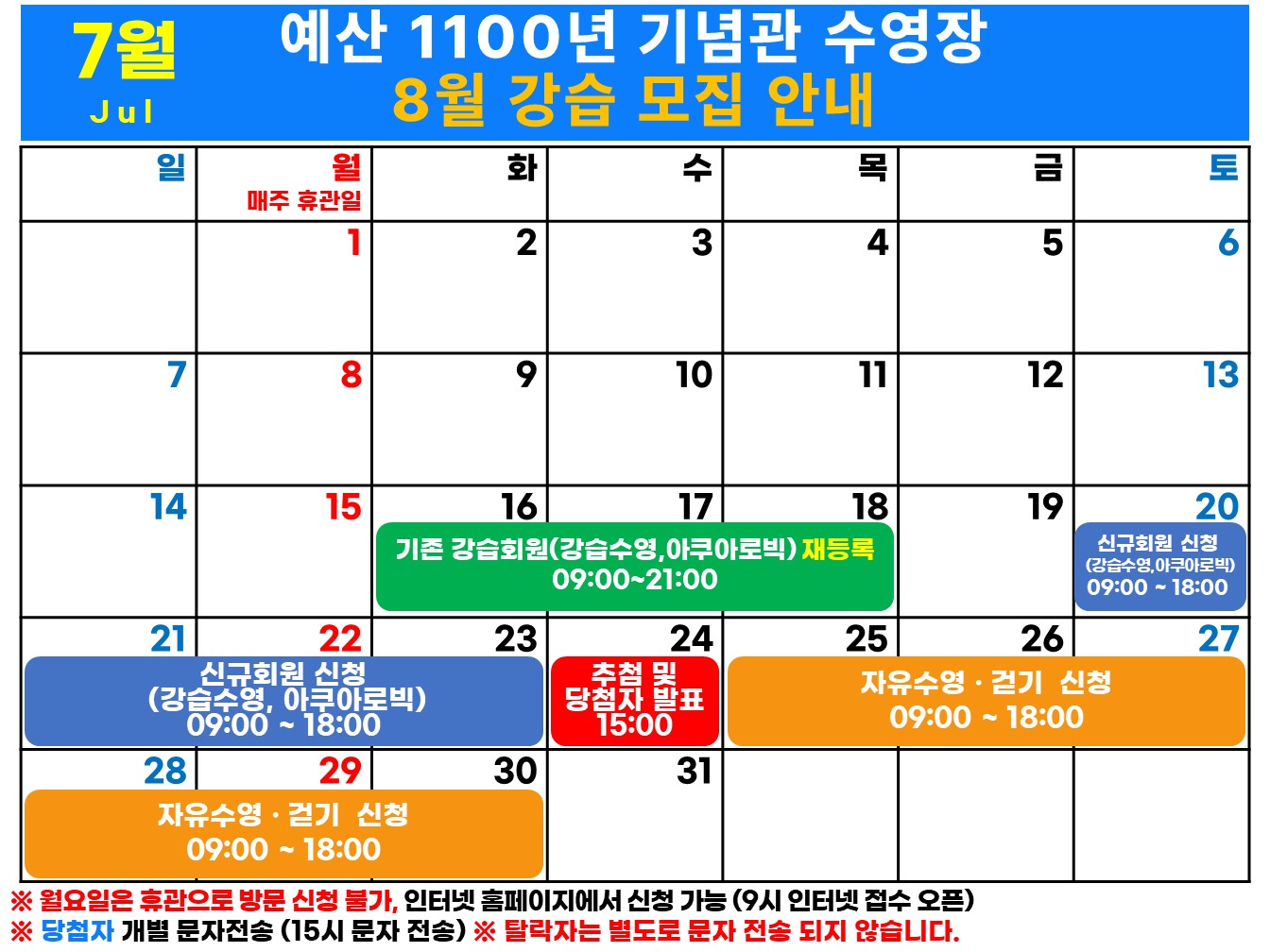 안녕하세요. 예산 1100년 기념관입니다. 8월 회원모집 일정을 다음과 같이 알려드립니다. ▶ 기존회원 재등록 : 2024. 7. 16.(화) ~ 7. 18.(목) ▶ 신규회원(강습수영 및 아쿠아로빅) 신청 : 2024. 7. 20.(토) ~ 7. 23.(화)