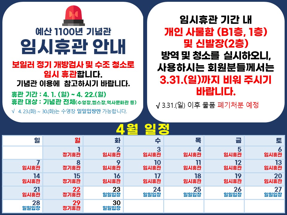 안녕하세요. 예산 1100년 기념관입니다. 1100년 기념관이 4월 중 임시휴관 하오니, 이용에 참고하시기 바랍니다. ▶ 휴관기간 : 2024. 4. 1.(월) ~ 4. 22.(월) ▶ 휴관대상 : 기념관 전체(수영장, 헬스장, 역사문화관 등) ▶ 휴관사유 : 보일러 정기 개방검사 및 수조청소 등 ※ 수영장 접수일정을 첨부하오니 참고해주세요.