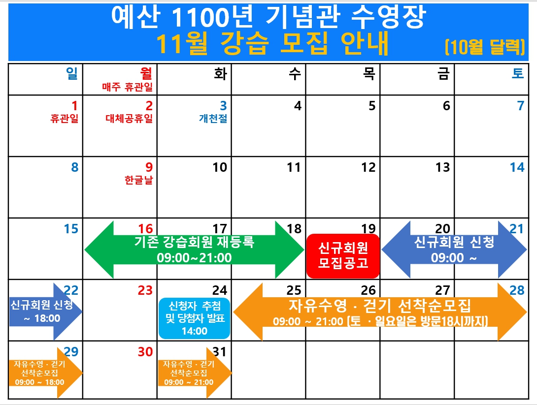 2023년 11월 수영장 신규 회원 모집 인원 및 일정을 안내하오니 이용에 참고하시기 바랍니다.